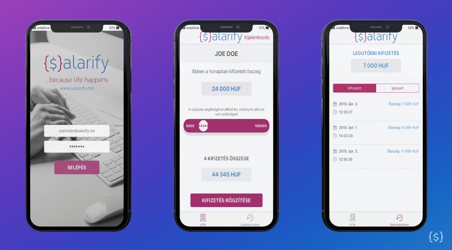 Egy rövid regisztrációt követően a Salarify egyedülálló ERP integrációival ellenőrzi többek között a ledolgozott bértömeget és végez KYC hitelesítést. A belépés után már csak egy feladat vár a felhasználókra: hogy kiválasszák a kívánt összeget, és egy gombnyomással elküldjék bankszámlájukra.