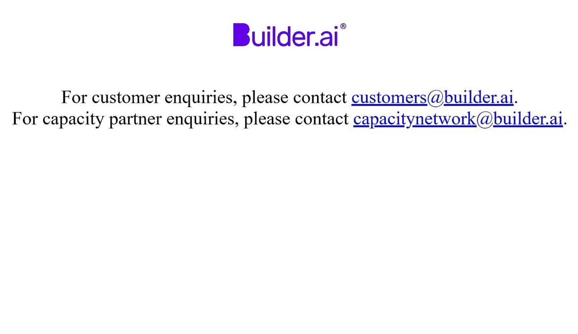 NYITÓKÉP: A Bulider.ai tartalmilag lenullázott honlapjáról készült képernyőkép, amin csak az ügyfelek és partnerek számára szolgáló mailcímeket tartalmazza. Forrás: a Builder.ai honlapja